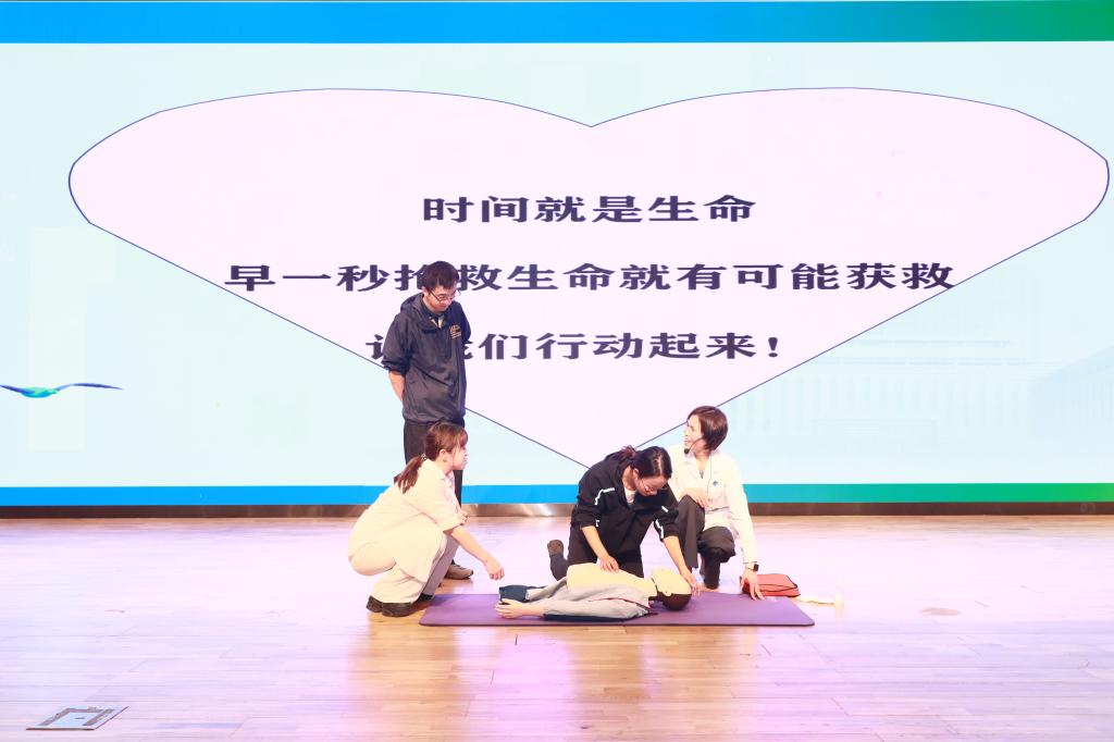 最后,学院邀请西安交通大学第一附属医院急诊科医生团队带来了沉浸式急救培训。医生通过人体模型演示了心肺复苏(CPR)的标准操作流程,详细讲解了AED设备的使用要点。部分老师和新生上台进行胸外按压和人工呼吸训练,医护人员逐一对操作手法进行纠正。
