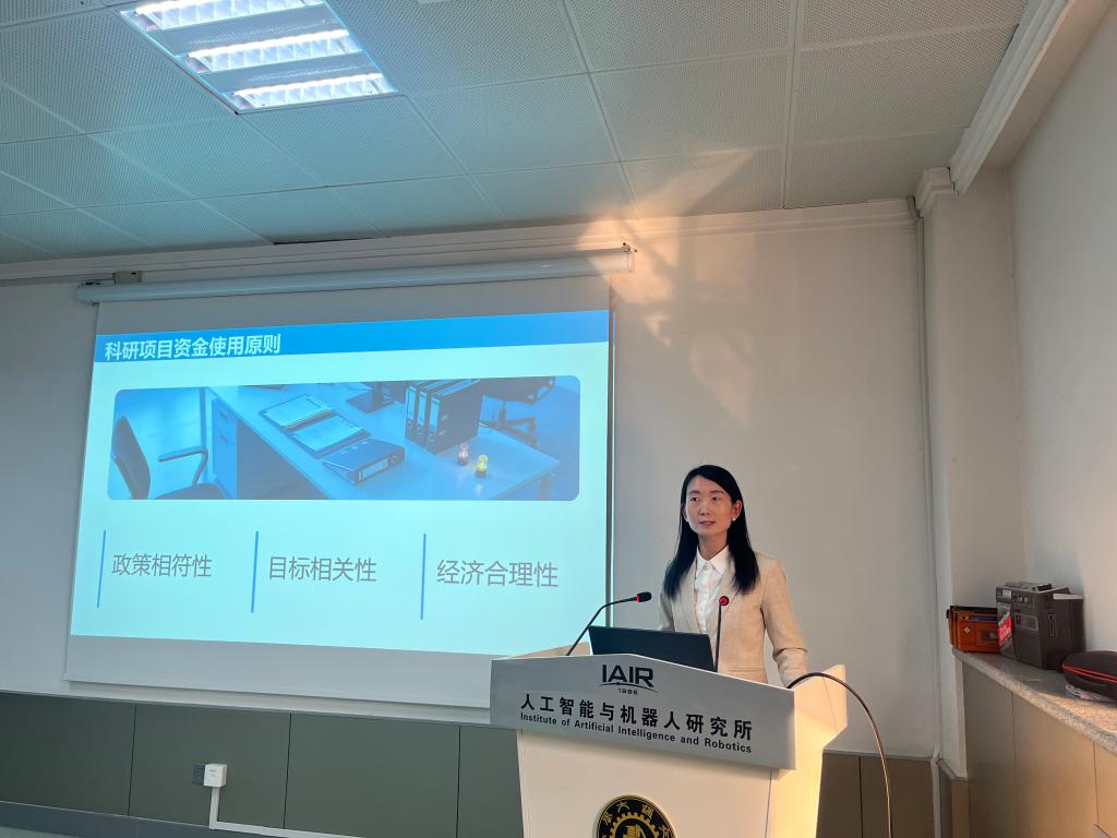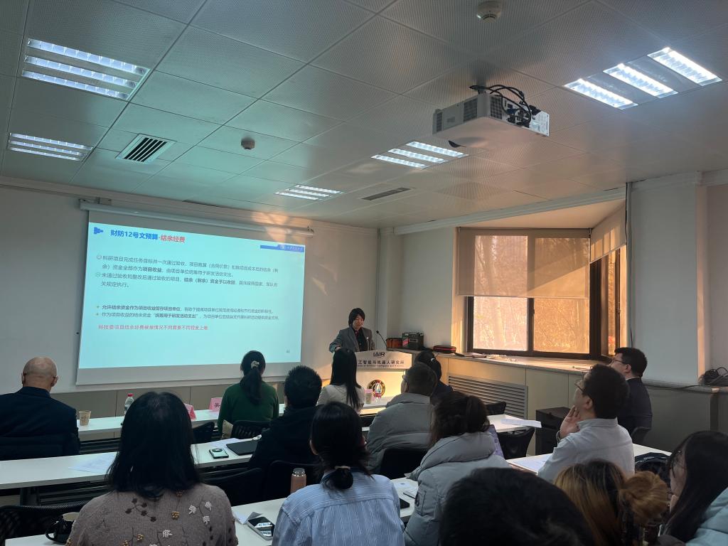 为帮助教职工更好地把握政策要求、提升业务能力,会议还特别邀请了学校相关职能部门负责人开展专题讲解。军工处副处长蔡丽红就军工项目申报与管理流程进行了系统说明;财务处吴婷、何焱、孙颖颖三位老师分别围绕财务报销规范、科研经费使用与自查、经费使用效益提升等内容,进行了深入浅出的解读与指导。